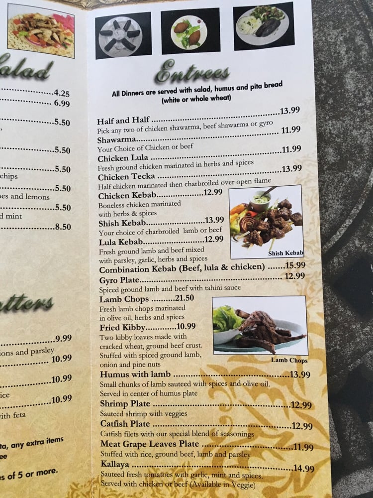Shish, lula and chicken. Served with salad, hummus and pita bread. .